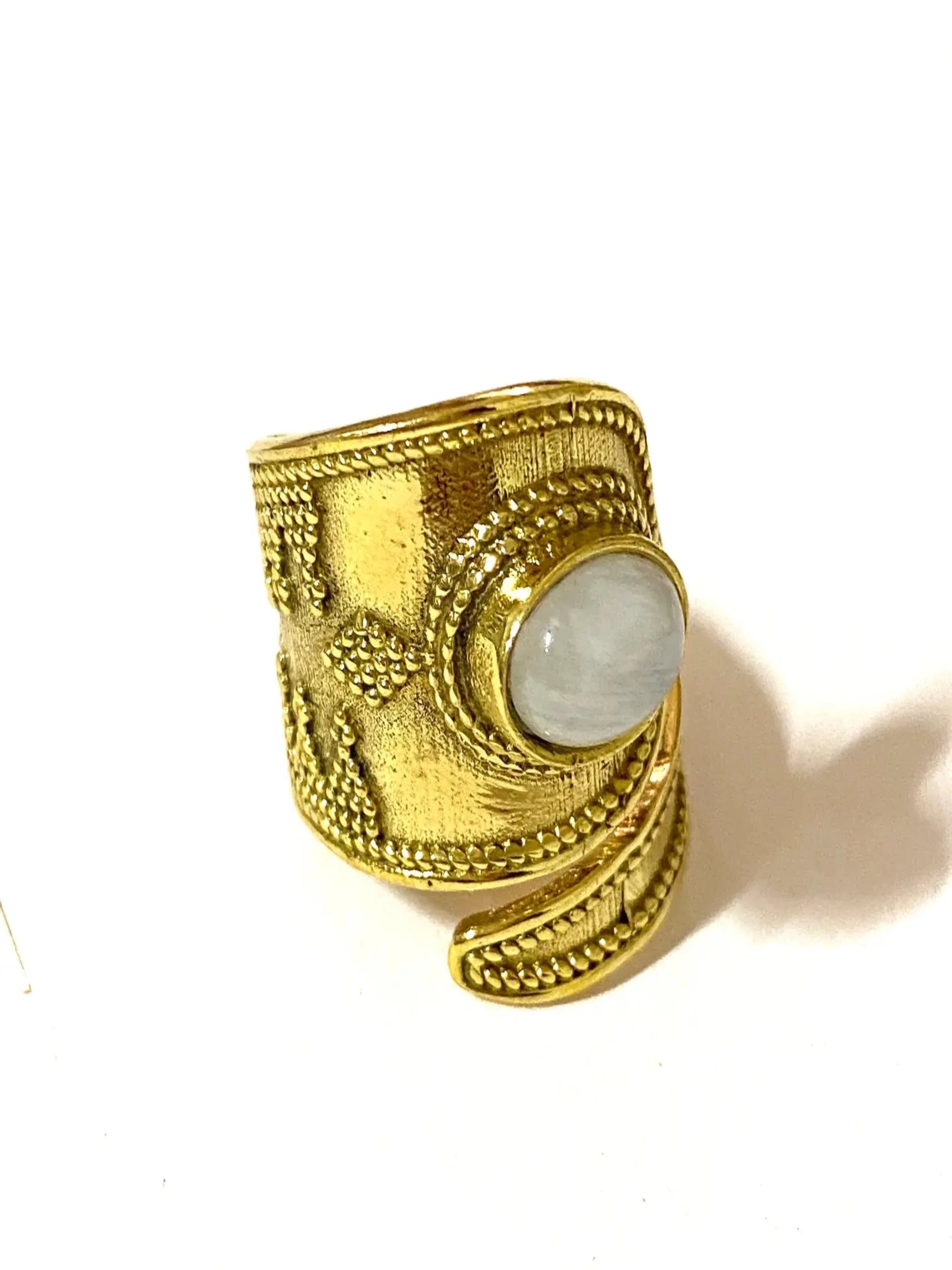 Stunning Carved brass ring. The Detail and design is perfection. Beautiful Gemstone setting. This Ring is adjustable.